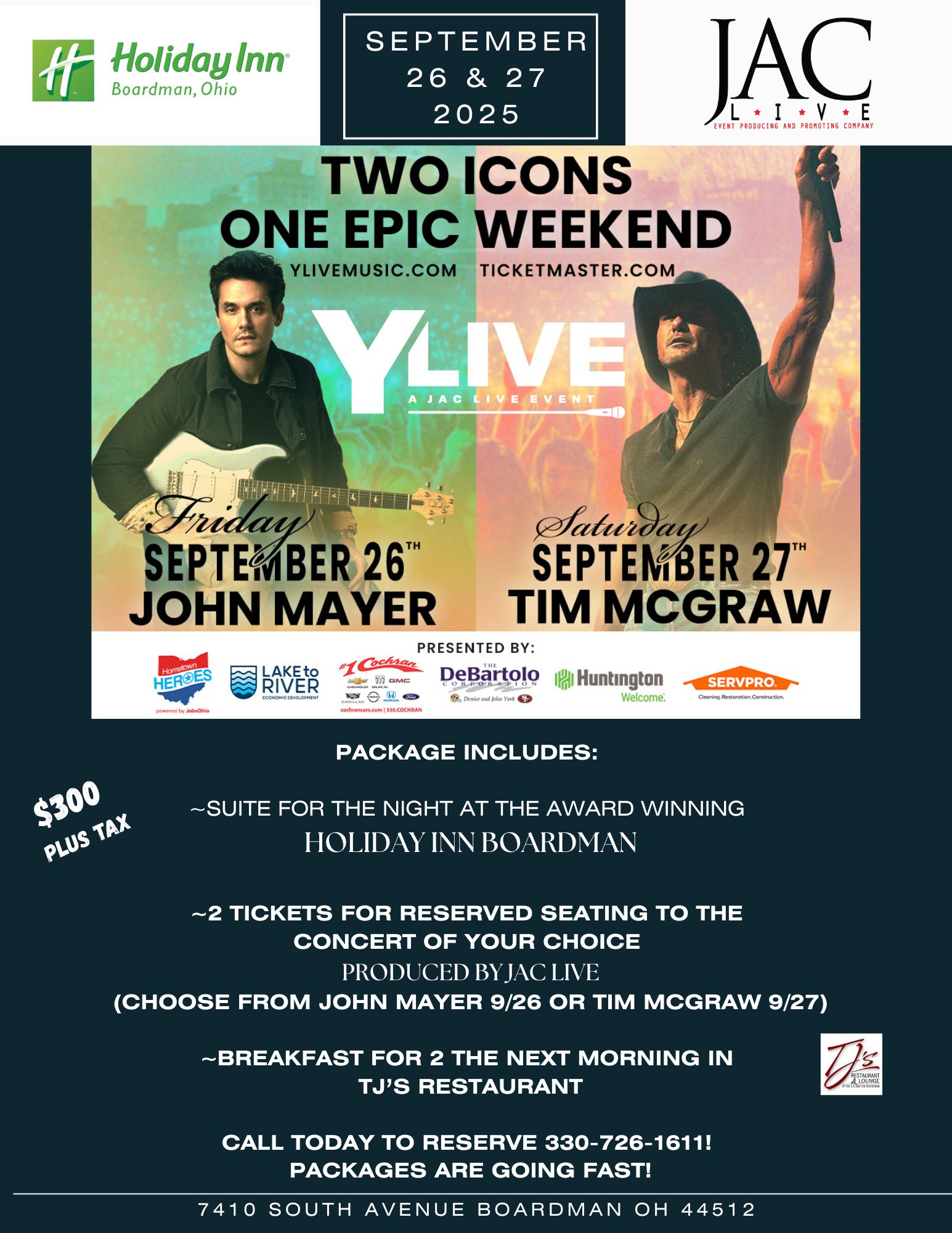 Package includes a suite for one night, two tickets for reserved seating to either John Mayer (Sep 26) OR Tim McGraw (Sep 27), and breakfast for two at TJ’s Restaurant. Call their Sales Office at 330-726-1611 to reserve.