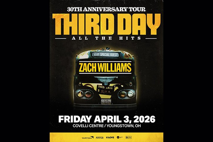 Covelli Centre 229 East Front Street, Youngstown, OH, United StatesThird Day: 30th Anniversary Tour is coming to the Covelli Centre on April 3, 2026 at 7:00pm. Experience the iconic band that shaped Christian music — Third Day — as they reunite for their 30th Anniversary Tour. For the first time in over a decade, original members Mac Powell, Mark Lee, David Carr, and Tai Anderson