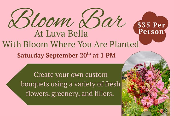 L’uva Bella Winery 6597 Center Rd., Lowellville, OH, United StatesBloom Bar at Luva Bella with “Bloom Where You Are Planted” on Saturday, September 20 at 1:00pm. Create a stunning bouquet with seasonal flowers, greenery, and fillers. Sip on a