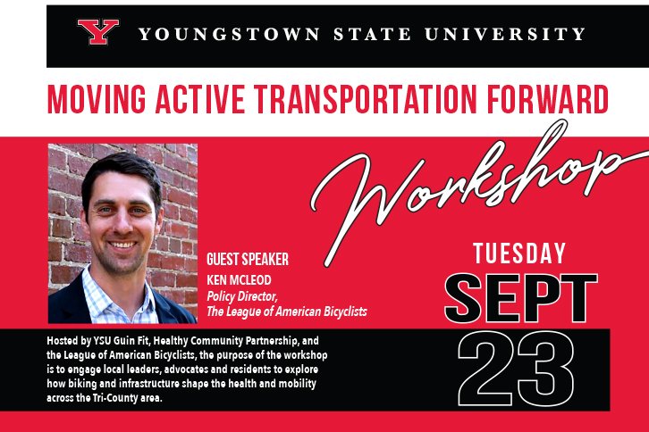 Stambaugh Auditorium 1000 Fifth Ave., Youngstown, OH, United StatesMoving Active Transportation Forward Workshop will be held on Tuesday, September 23 from 9:00am-3:00pm at Stambaugh Auditorium. Hosted by YSU Guin Fit, Healthy Community Partnership, and the League of American Bicyclists, the