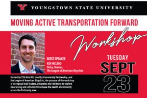 ![]() Moving Active Transportation Forward Workshop will be held on Tuesday, September 23 from 9:00am-3:00pm at Stambaugh Auditorium. Hosted by YSU Guin Fit, Healthy Community Partnership, and the League of American Bicyclists, the purpose of the workshop is to engage local leaders, advocates, and residents to explore how biking and infrastructure shape the health and mobility across the